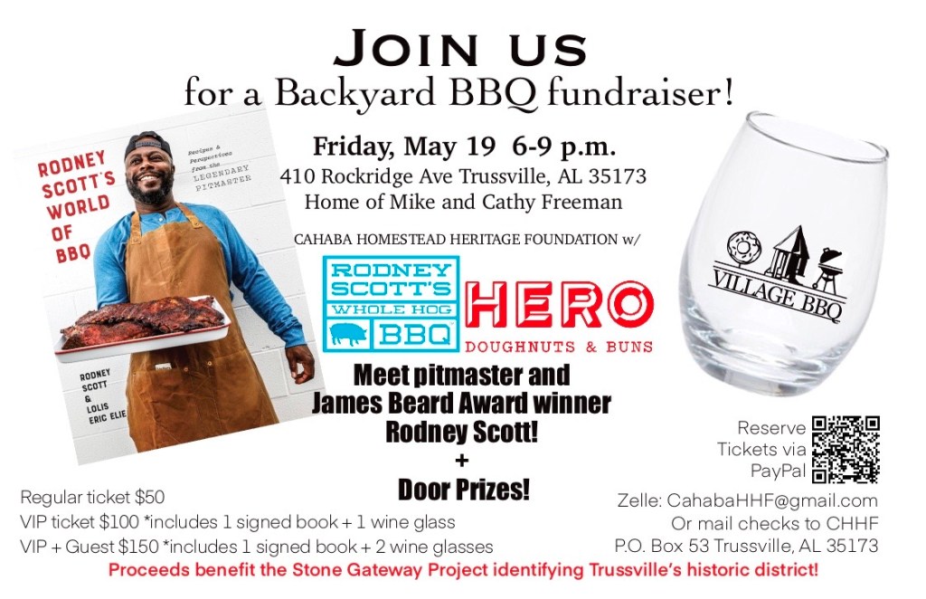 The event will be held at 410 Rockridge Avenue in Trussville, at the home of Mike and Cathy Freeman. Rodney Scott’s BBQ and Hero Doughnuts will cater the event, and Rodney Scott himself will attend!